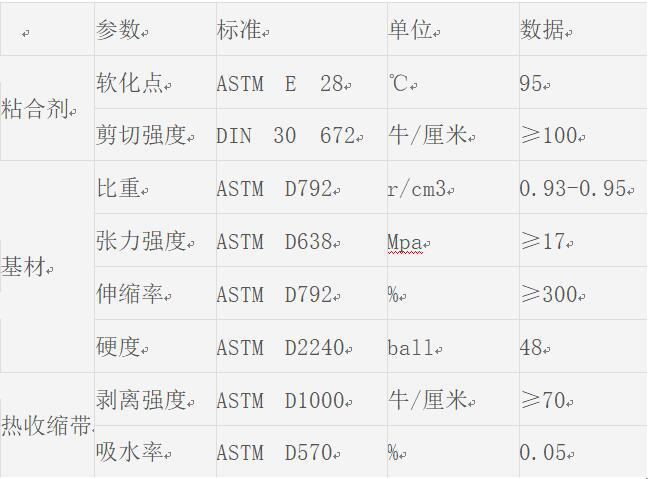 纤维增强型热收缩带(套)是由纤维增强复合PE片材挤出基材后,经辐射交联二次加工,再与进口热熔胶复合而成。具有施工快、粘接力强、热收缩快、密封效果好等优点。一般厚度为1.2-2.5mm,拉伸强度一般在 15Mpa左右,剥离强度大于70N/CM, 密封效果好。